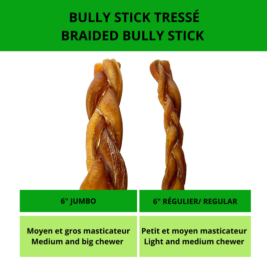 Our bully sticks are available individually, in mixed bags, in combo (regular and braided), in assorted dog chew pack or in bundle of 10,12 or 15 to save you more money.