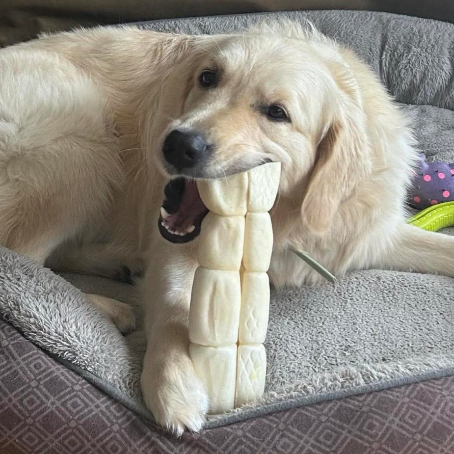 Our extra massive beef cheek roll contains multiple layers of unpuffed beef cheek which means your dog can enjoy it for long hours.